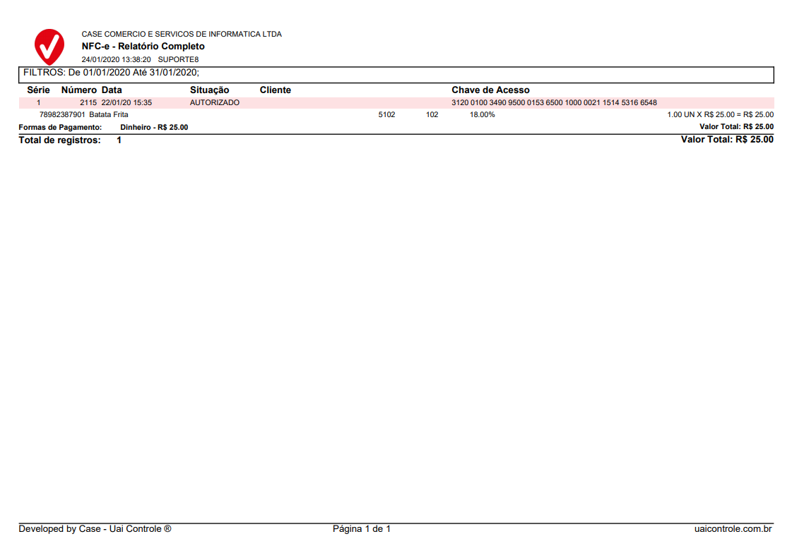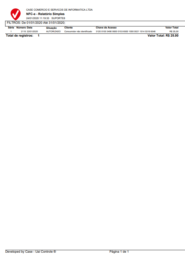 Repare que, no final do relatório é mostrado o valor total, esse totalizador é a soma de suas NFC-e´s, tudo de acordo com o filtro que você utilizou para gerar o relatório.
