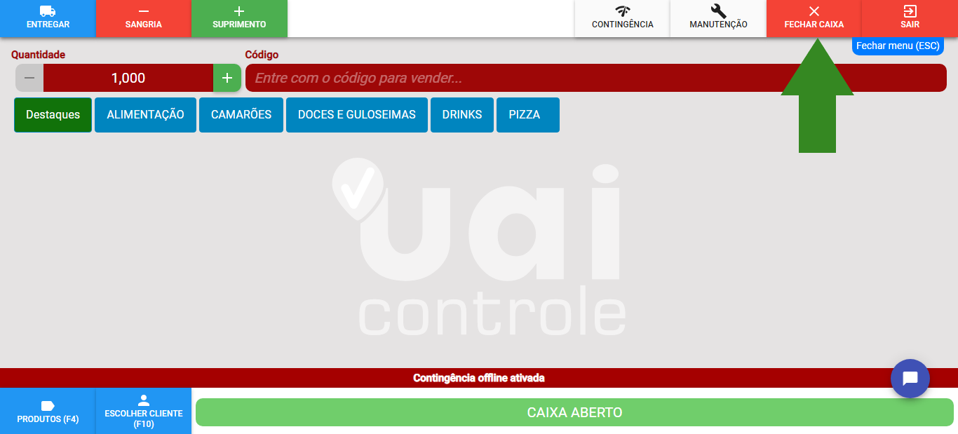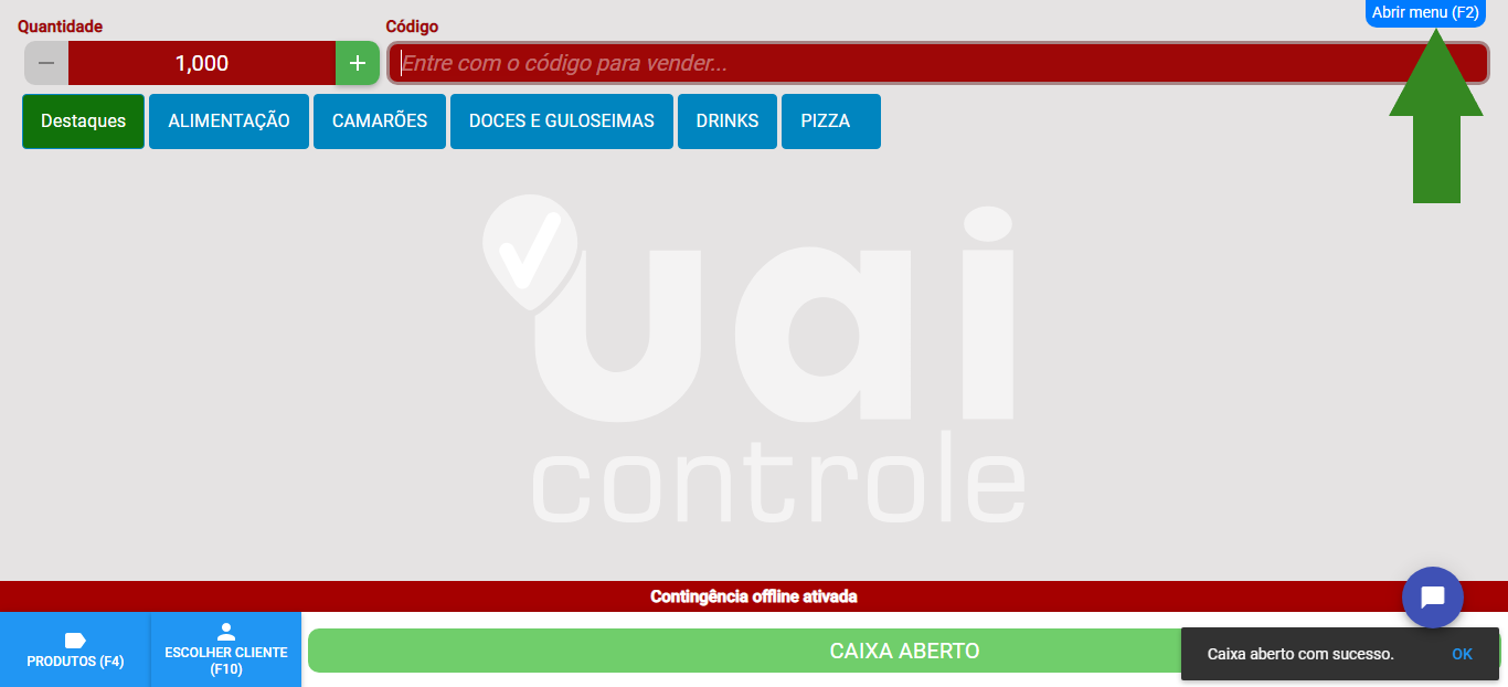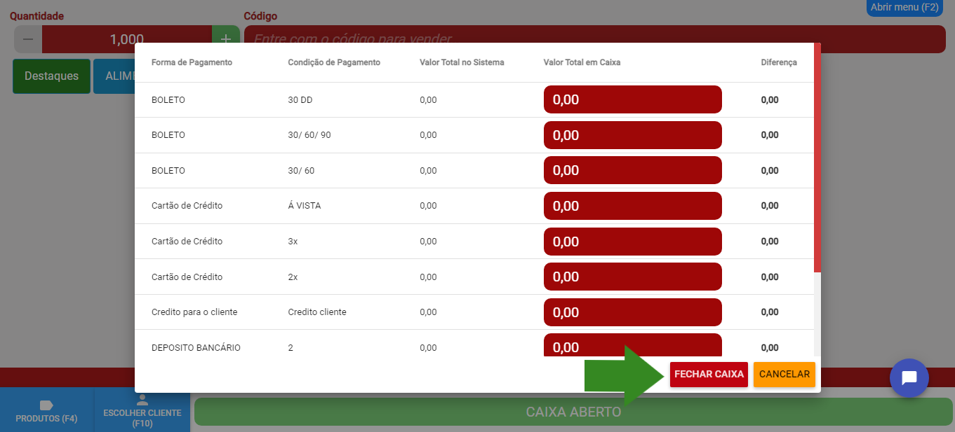 FECHAR CAIXA: Encerramento da movimentação realizada no PDV. Para finalizar, clique na tecla 'F2' e ou na opção mostrada abaixo e siga as instruções mostradas pelas setas verdes nas imagens abaixo: